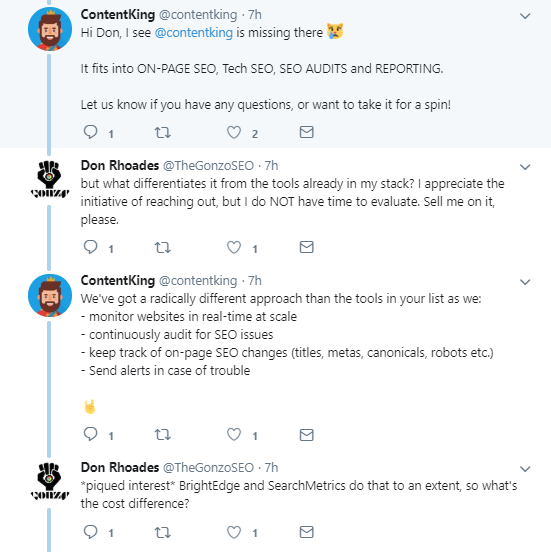 You can also make a list of potential prospects and add them to a private list. Here, you should keep a safe distance and mainly contribute to help requests or pain-points-related discussions where you can jump in and offer your valuable insights. Plus, keep an eye out on what your prospects are tweeting about, sharing, liking, or commenting so that you can prioritize your leads in an informed capacity.